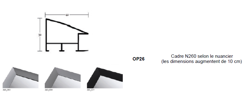 Sur le NOE Z et NOE D, vous avez la possibilité d’équiper le miroir avec un cadre au choix selon les options 23, 24 et 26 (se référer à la liste des options ci-dessous) :